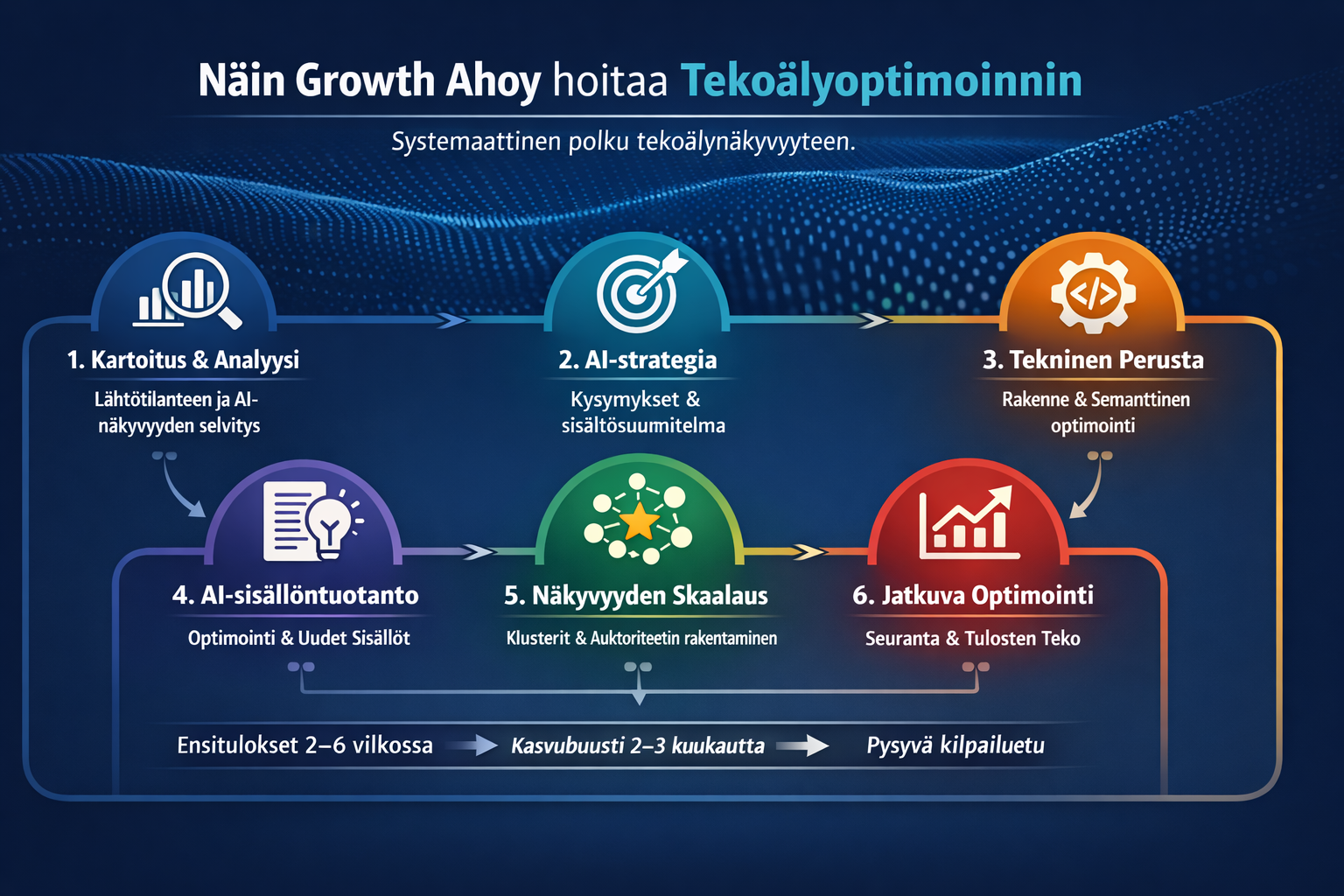 Tekoälyoptimointi sisältää tekoälynäkyvyyden analyysin, SEO & GEO -sisältöstrategian, teknisen optimoinnin, AI-optimoidun sisällöntuotannon sekä jatkuvan seurannan.